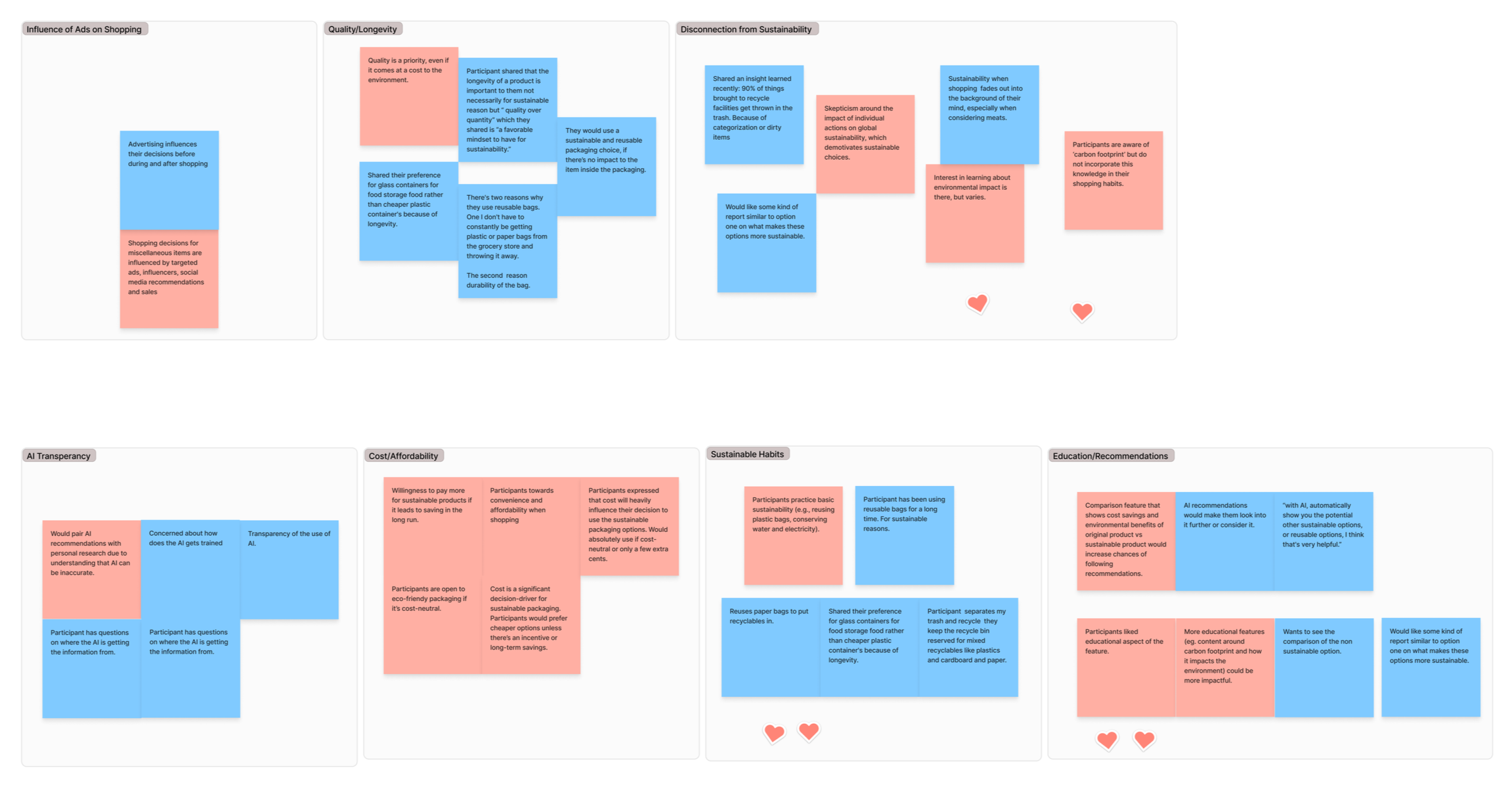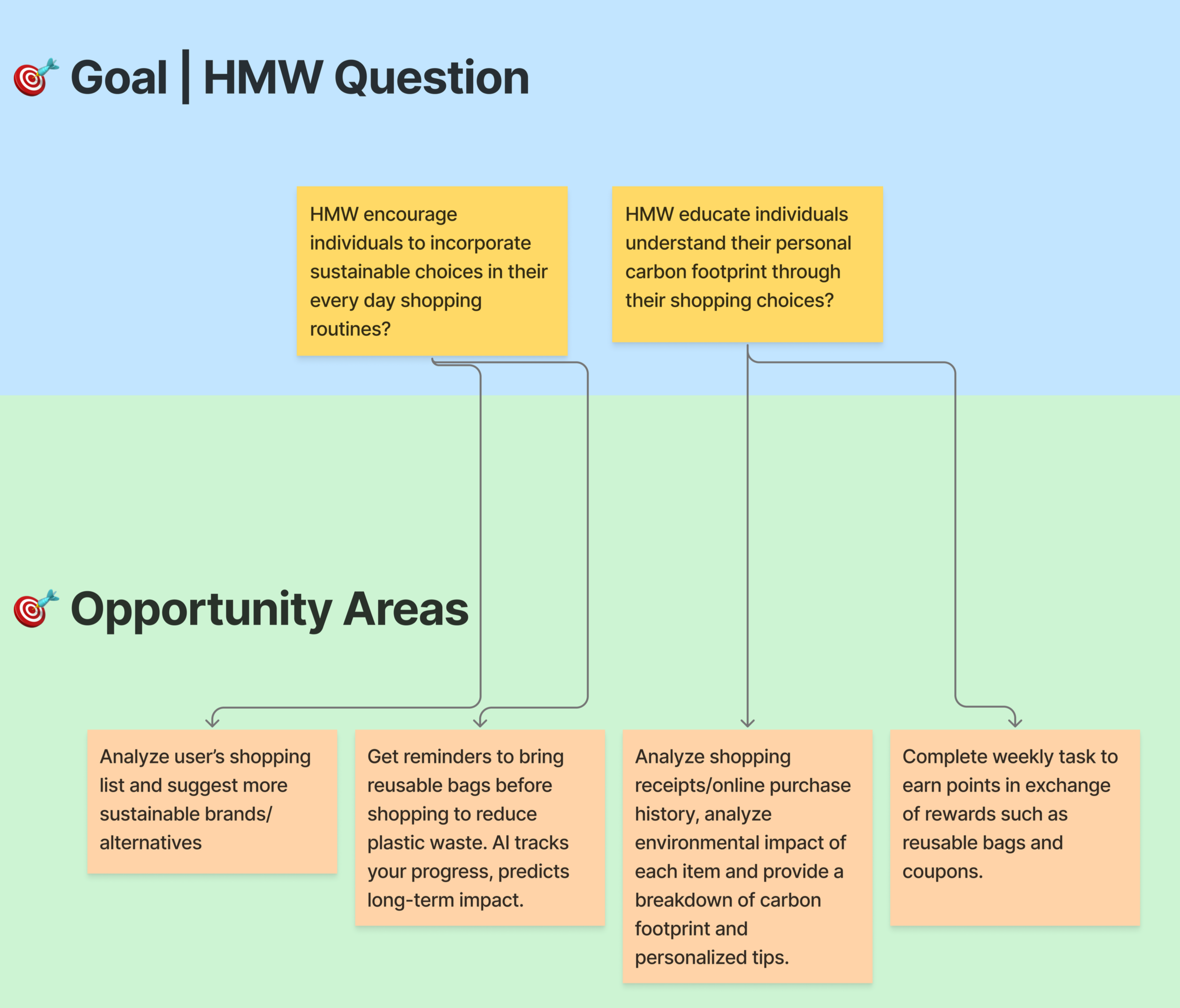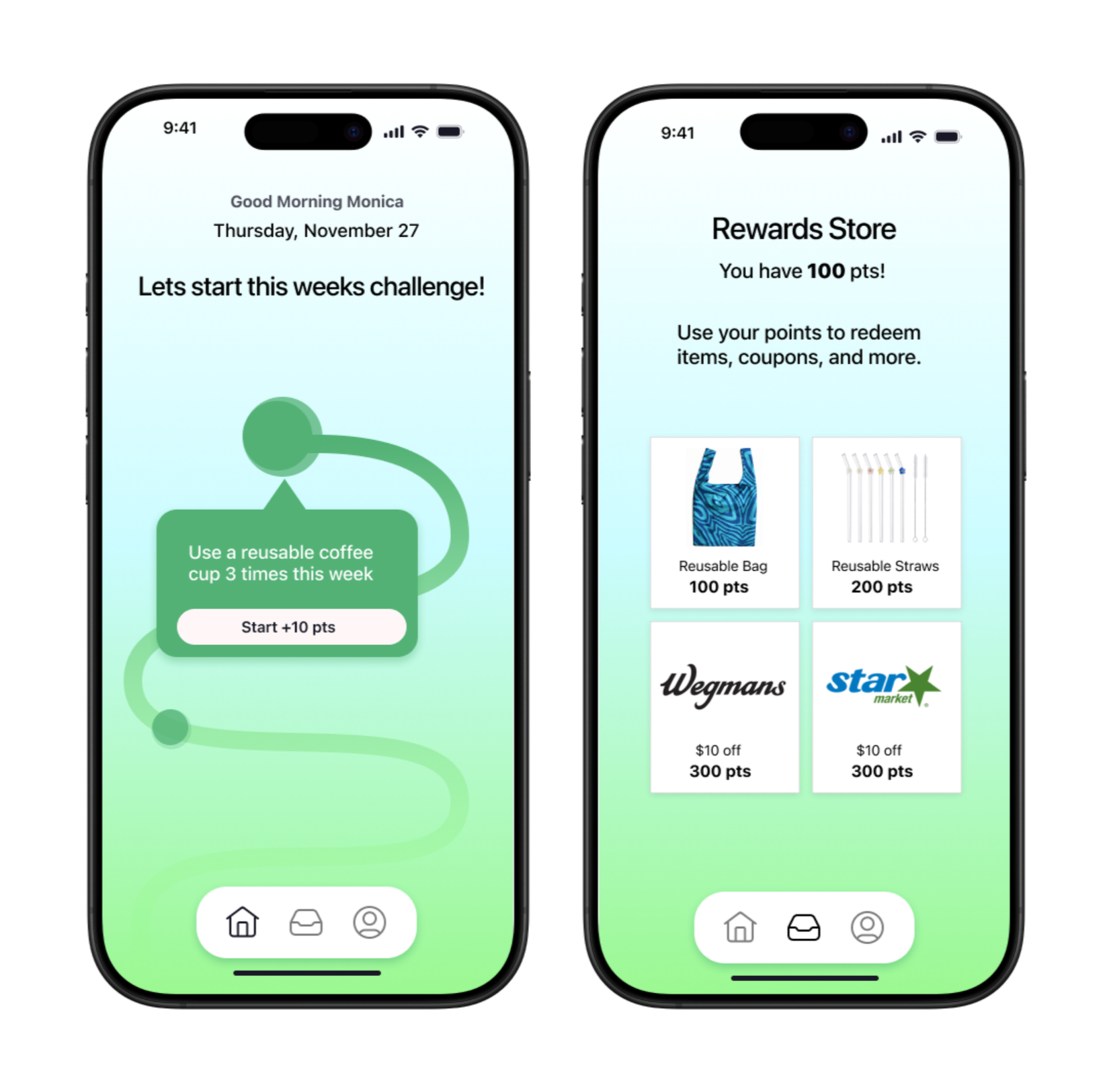 After conducting interviews and concept testing, we identified key opportunities around gamification, and habit formation, and reminders as effective ways to encourage sustainable behavior. These insights guided our brainstorming and prototyping sessions, where we explored how technology could make sustainability more engaging and achievable in everyday life.